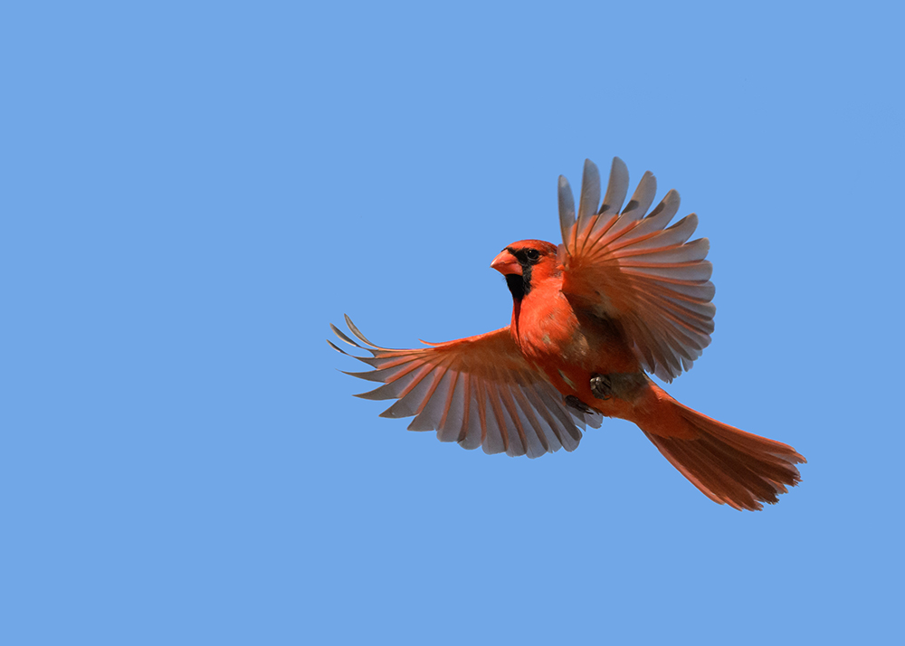 Bright Red Male Northern Cardinal In Flight Against Clear Blue S